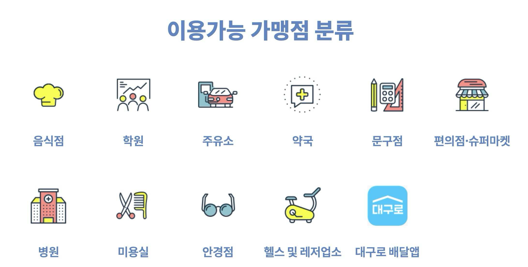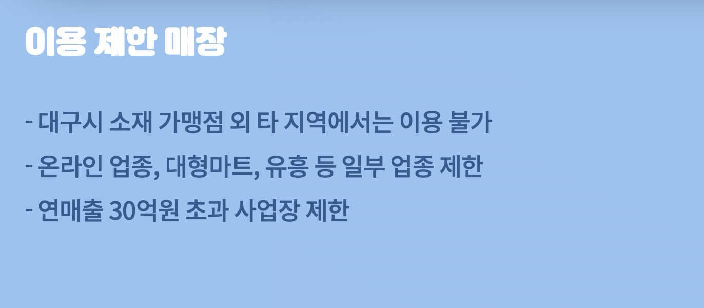 - 사용 제한: 백화점, 대형마트(이마트, 홈플러스 등), 유흥업소, 본사가 대구 외 지역인 직영점 등은 사용이 제한됩니다.