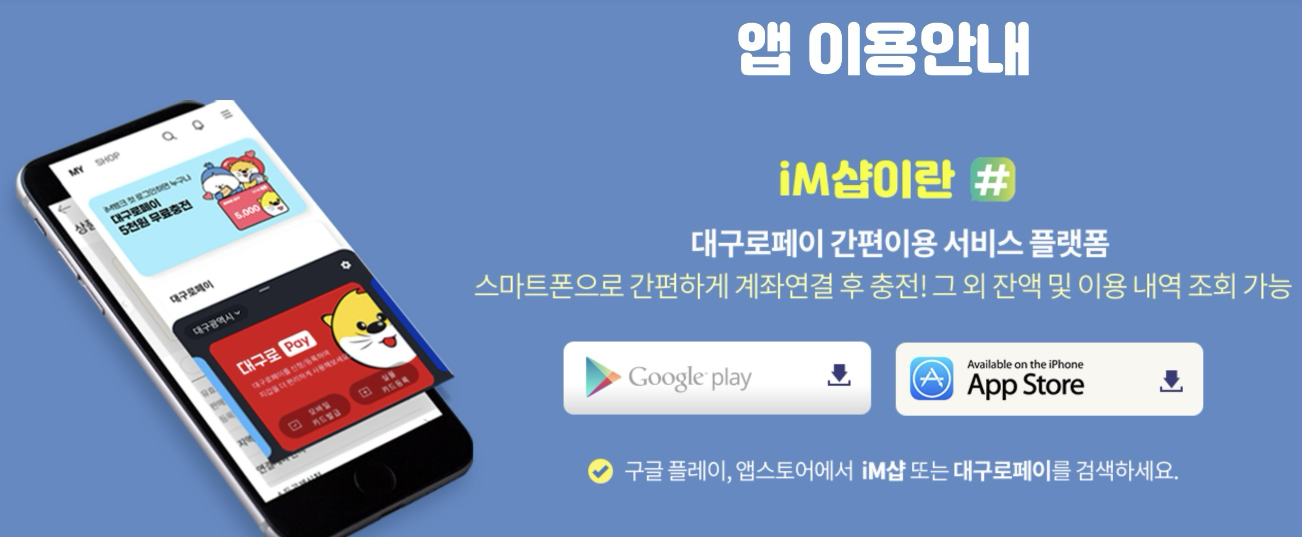 대구로페이 신청방법 지원금액 및 사용처 조회의 첫 단계는 바로 전용 앱(App) 설치입니다. 대구은행에서 운영하는 'IM#(아이엠샵)' 어플을 이용해야 합니다.