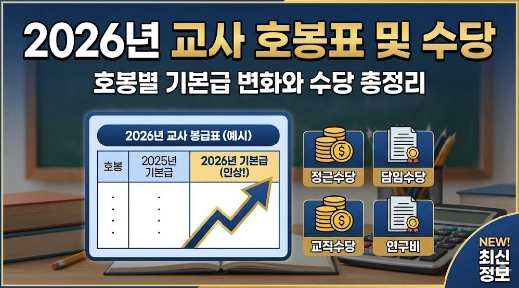 오늘 포스팅에서는 새롭게 바뀐 2026년 교사 호봉표 및 수당의 호봉별 기본급 변화와 신설된 수당 항목까지 꼼꼼하게 분석해 드립니다. 미리 2026년 교사 호봉표 및 수당을 확인하시고 한 해의 재무 계획을 세워보시길 바랍니다.